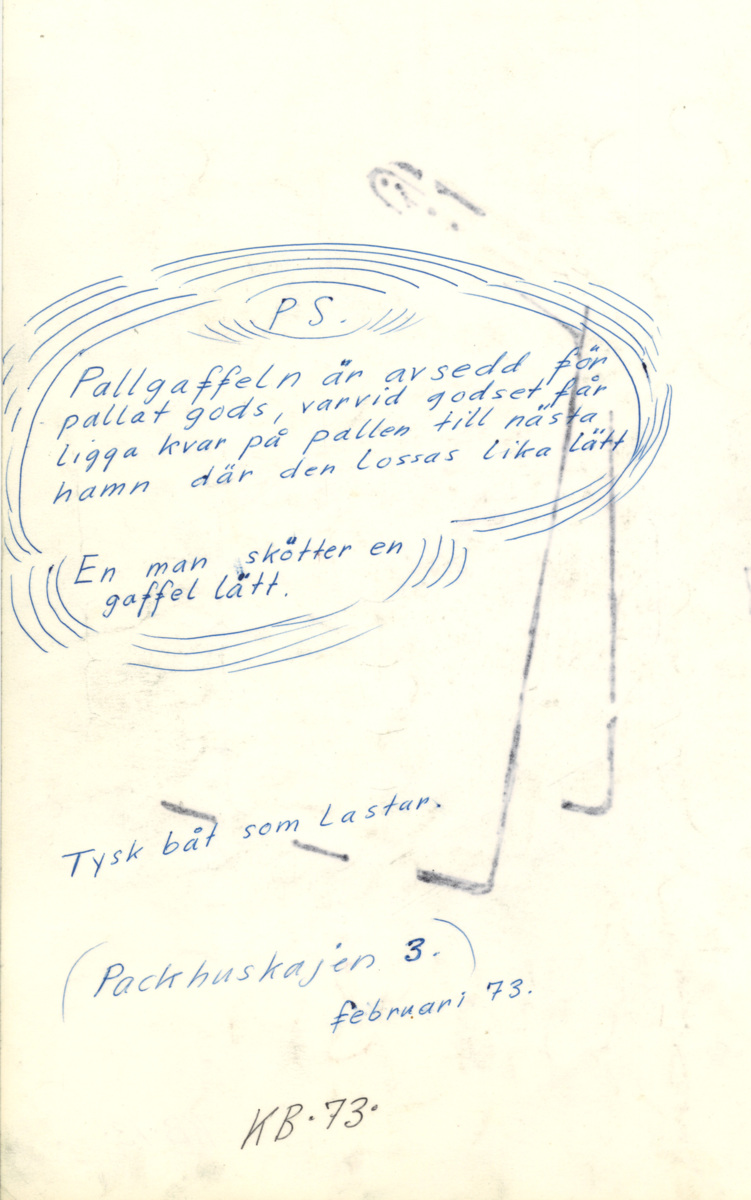 Påskrift: Ps. Pallgaffeln är avsedd för pallat gods, varvid godset får liggar kvar på pallen till nästa hamn där den lossas lika lätt. En man skötter en gaffel lätt. Tysk båt som lastar (Packhuskajen 3.) februari 73. K.B.73.