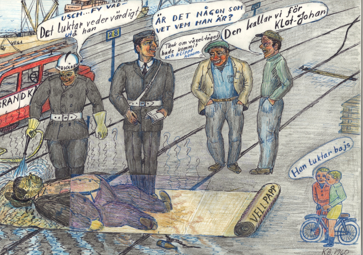 På teckningen ligger en man tvärs över tågrälsen, på utrullad wellpapp, vid Masthuggskajen i Göteborg. En brandman är i färd med att spola av mannen med en vattenslang och bredvid står en polis samt två andra män, sannolikt hamnarbetare. I hörnet syns två barn med en cykel och i bakgrunden skymtar en brandbil och vid kajen ett lastfartyg vid namn VEGA. Enligt utsago hade mannen druckit mycket alkohol och somnat på plasen, och polisen hade problem att få honom därifrån.
