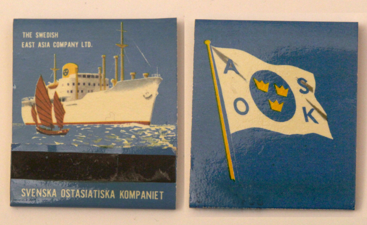 Tändsticksplån i hårdare kartong, innuti finns 18 tändstickor i trä med röd tändmassa. Flerfärgstryck föreställande ett lastfartyg och en mindre djonk, på baksidan av plånet finns ASOK:s rederiflagga.