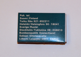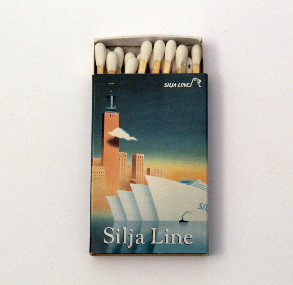 Tändsticksask i papper, innehåller tändstickor i trä med vit tändmassa. Färgtrycket föreställer Stockholms stadshus och fyra fasrtygsstävar och en liten bogserbåt.