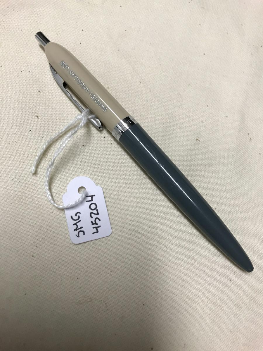 Bläckpenna tillverkad i ljusgrå och mörkgrå plast med kromade detaljer i metall.