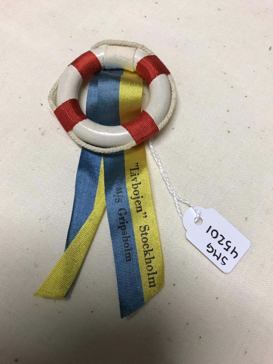 Liten livboj i trä med textildetaljer i blått, gull, vitt och rött. Broschen såldes ombord M/S GRIPSHOLM till förmån för Sjöräddningssällskapet.