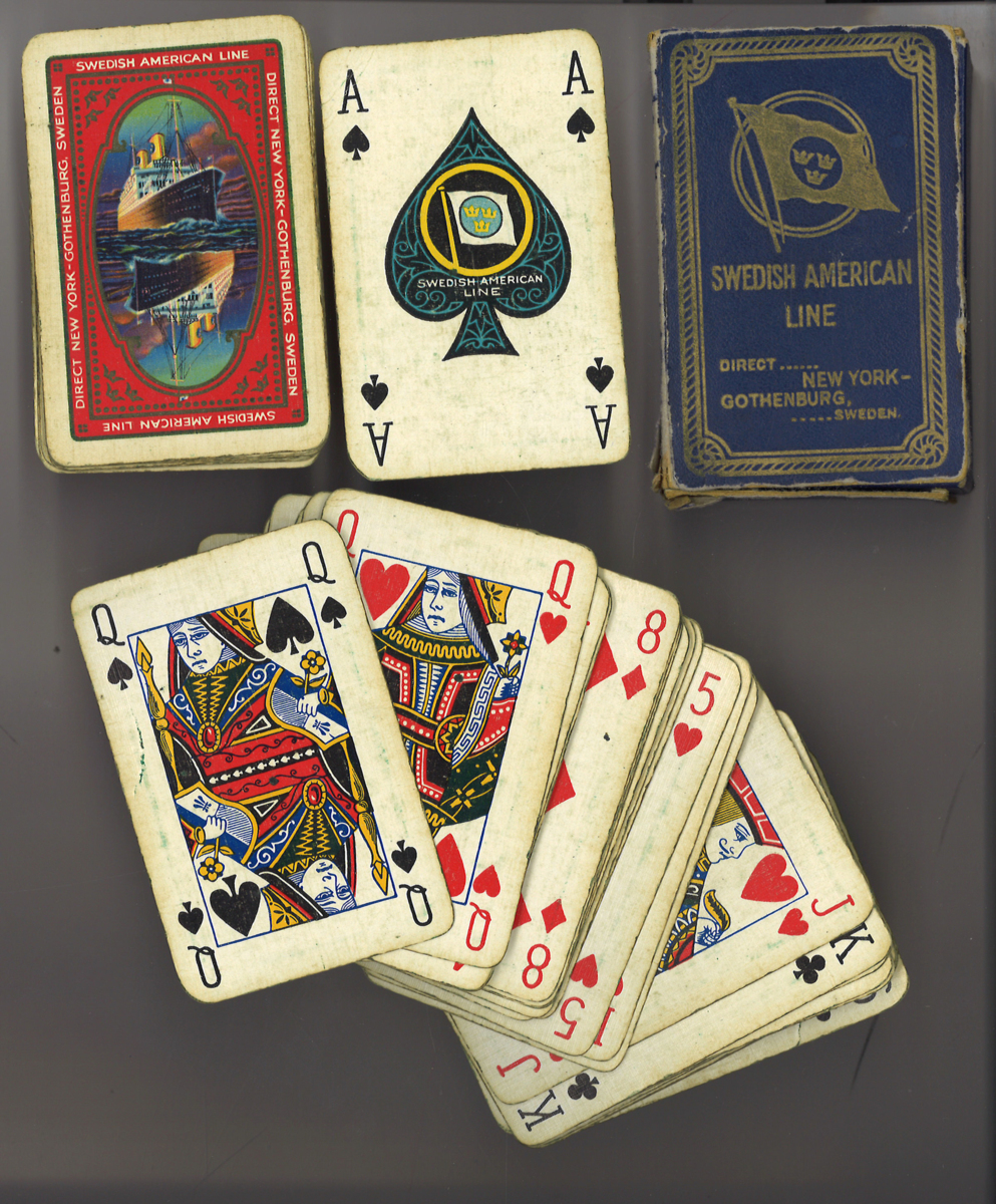 Kortlek med reklamtryck för SAL föreställande GRIPSHOLM till havs i en röd ram med gulddetaljer. Förvaras i ett mörkblått pappersetui med guldtryck. Kortleken saknar några kort och etuit i papper är skadat. Användes av gåvogivaren under frivakten som motorman ombord GRIPSHOLM år 1935.