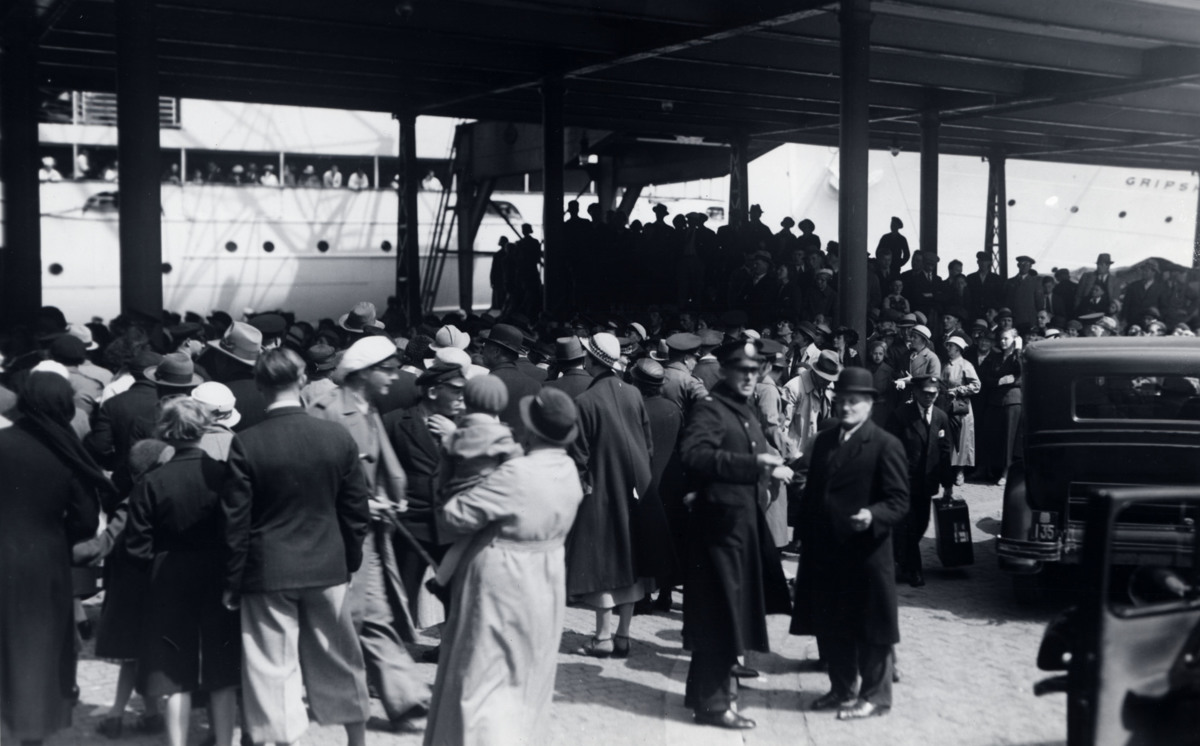 Folksamling vid Amerikakajen vid Greta Garbos ankomst till Göteborg 1935