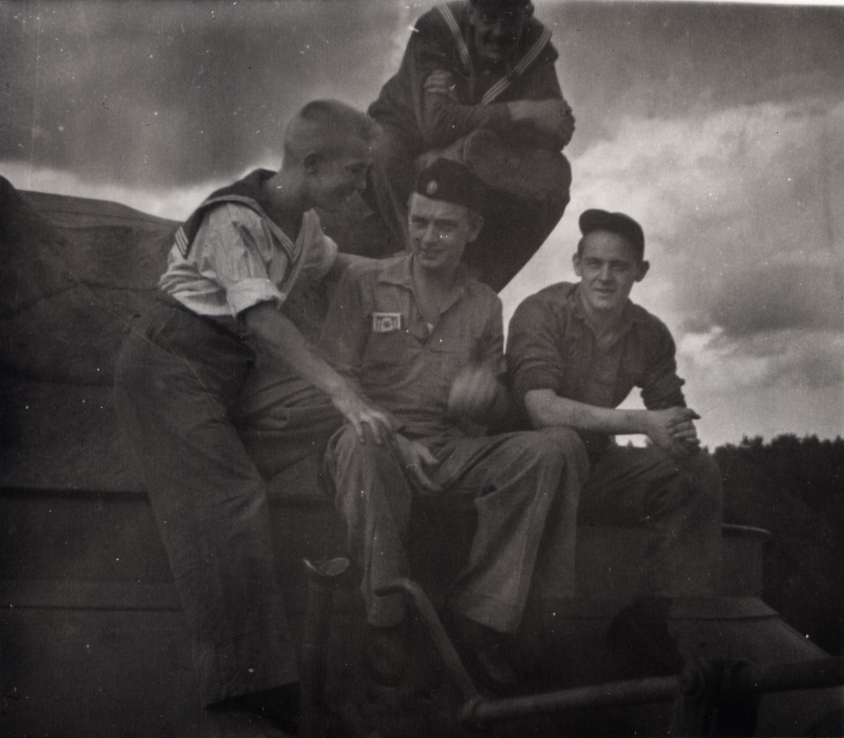 På bilden syns unga män i arbetskläder och sjömansdräkt. Fotografiet är taget under tjänstgöring i Flottan. Männen heter (från vänster) Persson, Johannesson, Alarik Edvardsson. Mannen ovanför är okänd.