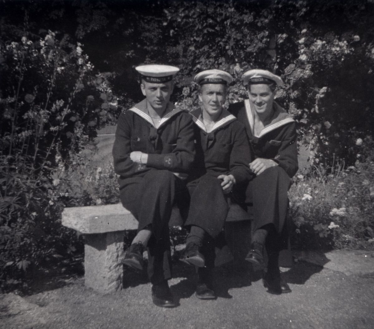 Tre besättningsmän sitter på en bänk: Johannesson, okänd och ev en vid namn Lind. Besättningsmännen har uniform på sig samt sjömansmössa. På mössbanden står det PATRICIA omgivet av två kronor. Kronornas förekomst och placering betyder att fotografiet är taget under tjänstgöring i Flottan.