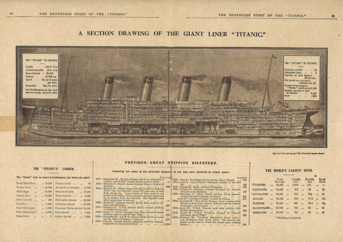 "The deathless Story of the Titanic", skrift författad av Philip Gibbs. Utgiven i tidningsformat med illustrationer av Lloyds Weekly News snart efter TITANICs förlisning