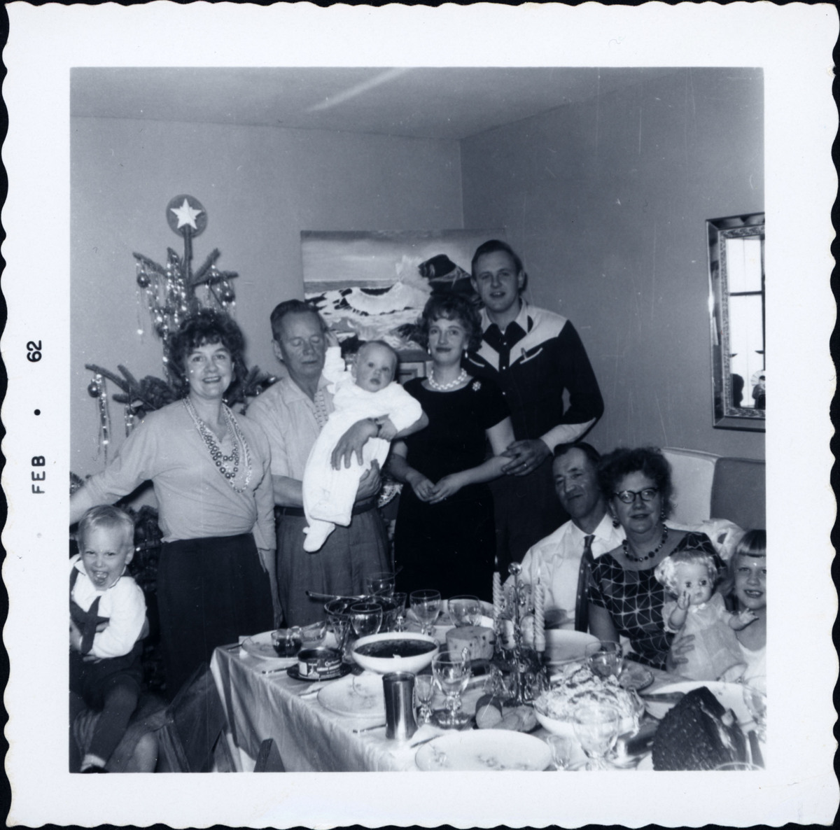 Sonja med familj firar jul 1961. På bilden syns Michael (Vivannes son, Sonjas barnbarn), Sonja, maken Carl med barnbarnet Carl Gustaf i famnen, dottern Vivianne med make och i soffan Sonjas syster Vera med maken Karl och dotter.