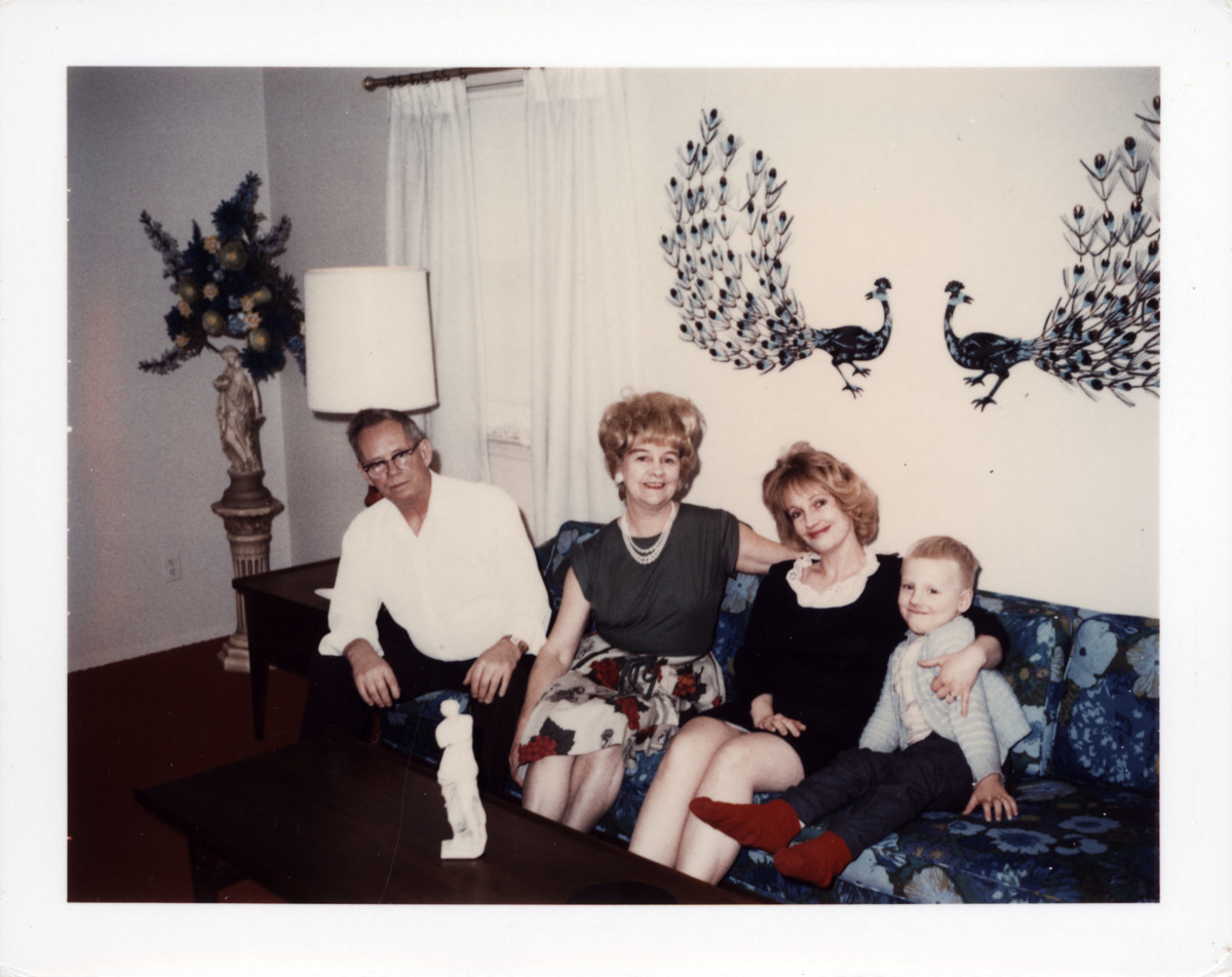 Sonja med maken Carl, dottern Vivianne och barnbarn. Målning på väggen bakom, föreställande påfåglar, har Sonja målat.