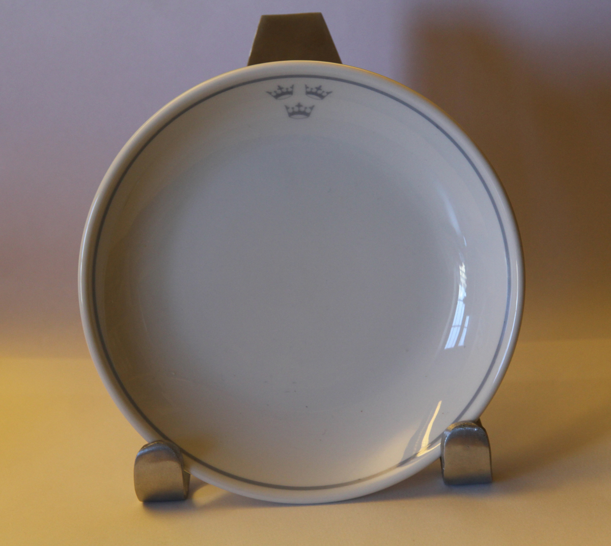 Mindre uppläggningsfat i vitt porslin med SALs tre kronor i ljusgråblått tryck på kanten samt en ränd runt brättet.