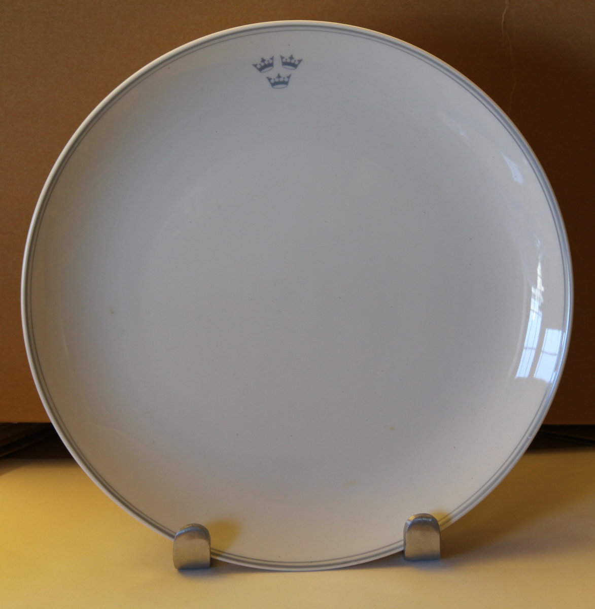Assiett i vitt porslin med SALs tre kronor i ljusgråblått tryck på kanten samt två ränder runt brättet.