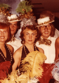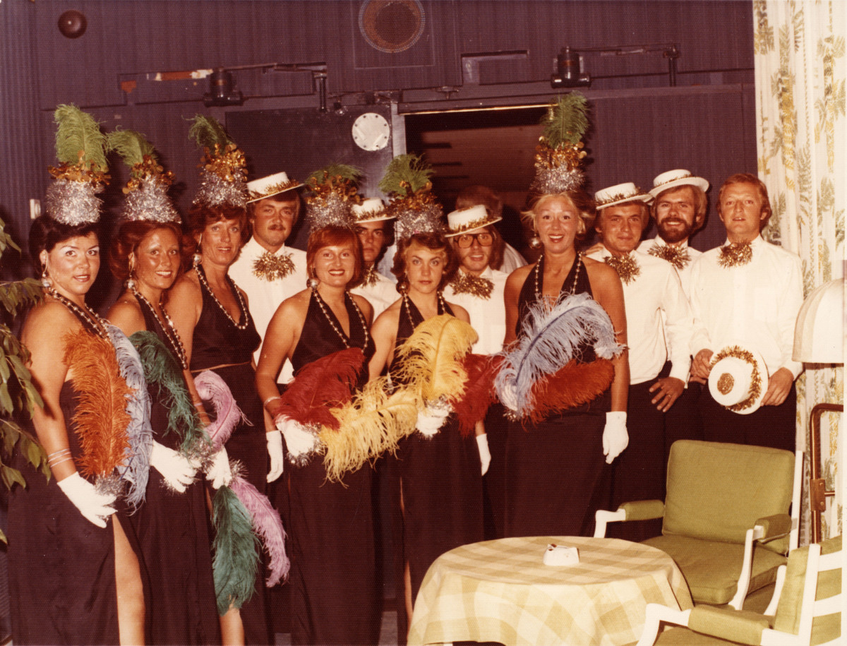 Fotografiet visar delar av besättningen ombord GRIPSHOLM i samband med ett uppträdande för passagerarna. Eva Thormählen står i mitten, med gul fjäder i handen. De övriga på bilden (utan inbördes ordning) är Rosalie Sjöstrand, Gerd Mårtensson, Birgitta Heikki, Marianne Lang, Gisela Maurer, Nils Persson, Sven Nordblom eller Björn Bergh, Per Malgerud, Ulf Lémón, Berndt Ellenius och Stephan Svenning.
