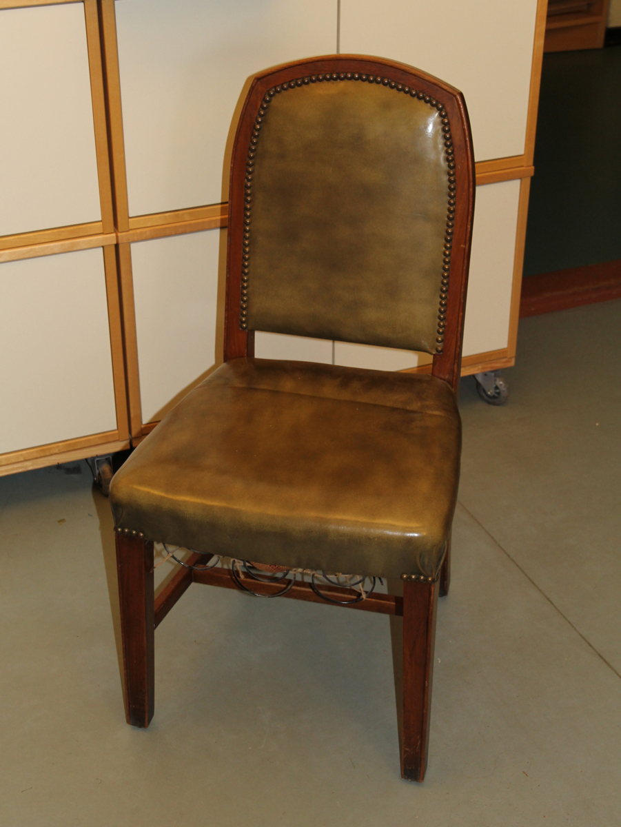 Stol från Svensk Amerika Liniens fartyg KUNGSHOLM. Med stoppad dyna och rygg. Byggd i mörkt trä och klädd i mossgrönt fuskläder. Tillverkad i Skottland.