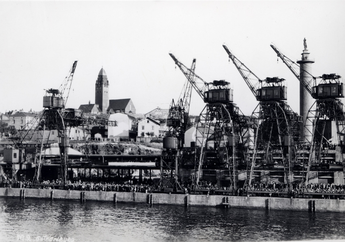 Folksamlingen väntar på ankomsten av ett av Svenska Amerika Liniens fartyg