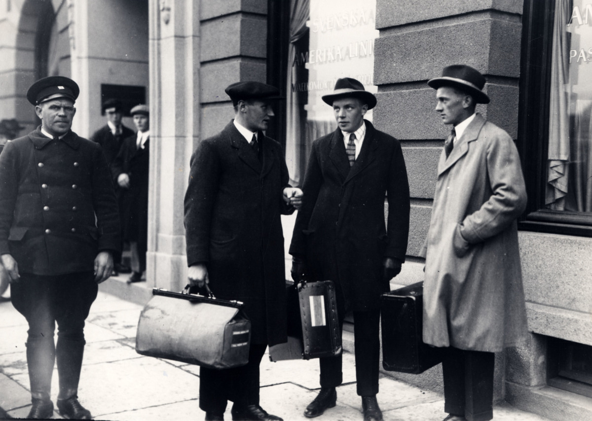 Tre män står utanför en av Svenska Amerika Liniens byggnader, med resväskor i handen. Sannolikt står de utanför hotell Göta Källare på Hotellplatsen i Göteborg.