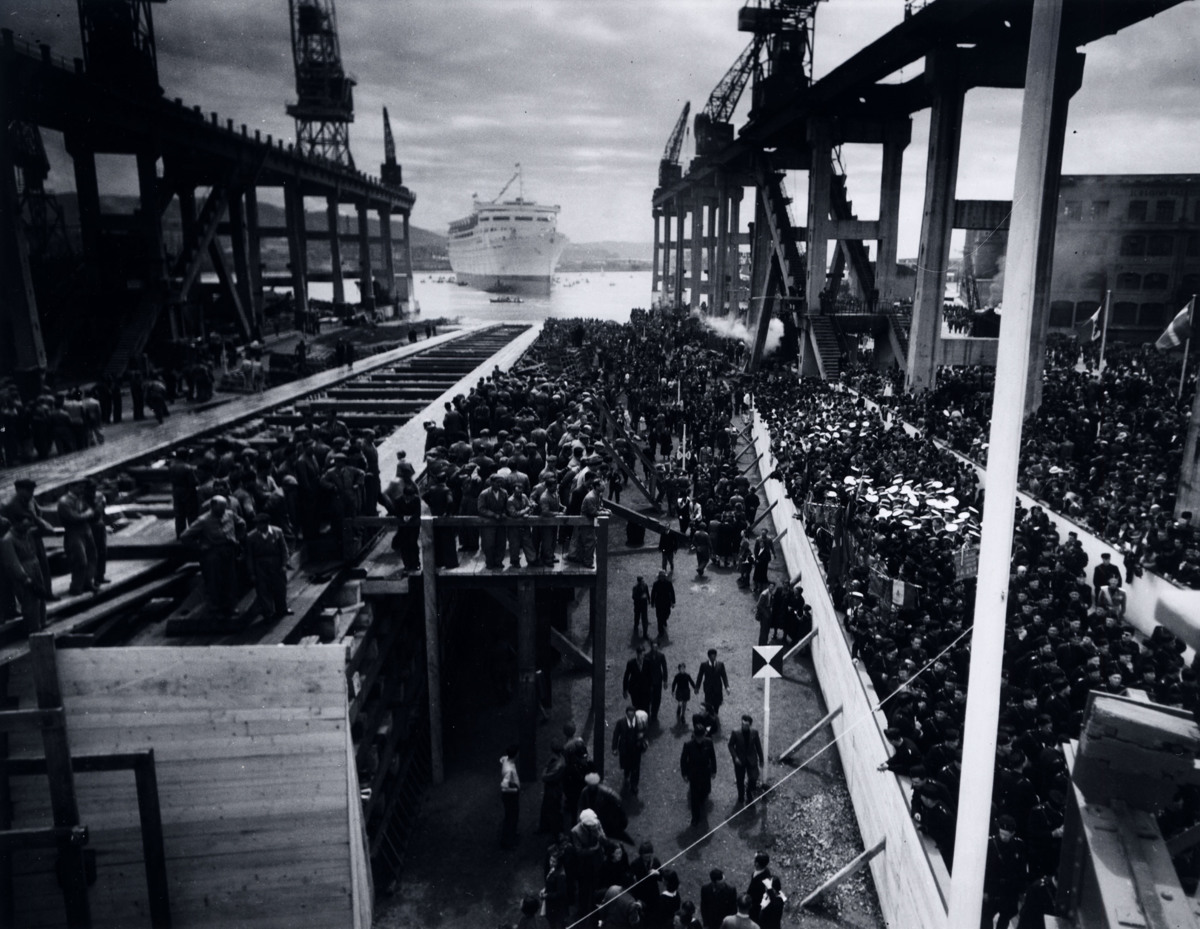 STOCKHOLM har precis sjösatts från varvet i Monfalcone, Italien. Fartyget skymtar i bakgrunden, liggandes i vattnet. Många åskådare samt arbetare från varvet står och betraktar.