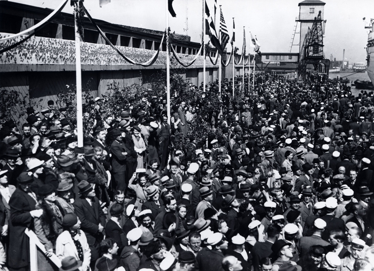 Stor folksamling utanför Svenska Amerika Liniens byggnad (Amerikaskjulet/Betongskjulet) vid Amerikakajen i Göteborg, i samband med att GRIPSHOLM ska avgå på sin studentresa i maj 1938