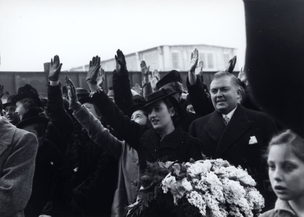 Åskådare vid STOCKHOLMs sjösättning vid varvet i Monfalcone i Italien. Fotorafiet taget 1938, sannolikt 29 maj. Flera åskådare på bilden gör fascist-hälsning.