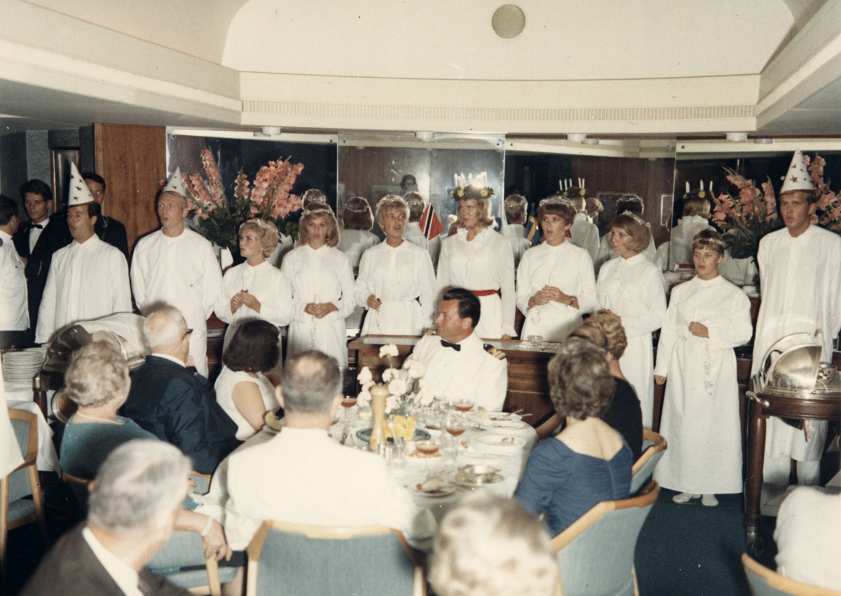 På bilden sitter Curt Dawe till bords tillsammans med en grupp passagerare. Delar av besättningen har bildat ett luciatåg som uppträder för passagerarna.