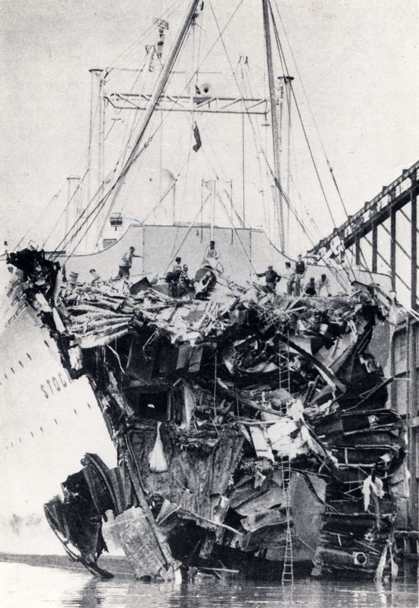 Fotografiet är taget efter STOCKHOLMs kollision med ANDREA DORIA, vilken skedde på kvällen 25 juli 1956. STOCKHOLM tog sig för egen maskin till en hamn i New York och anomk dit 27 juli. Fartyget reparerades senare på hösten 1956 vid varvet Bethlehem Steel. Fotografiet är taget någon gång snart efter ankomsten till New York, d v s under perioden slutet av juli - september 1956.
