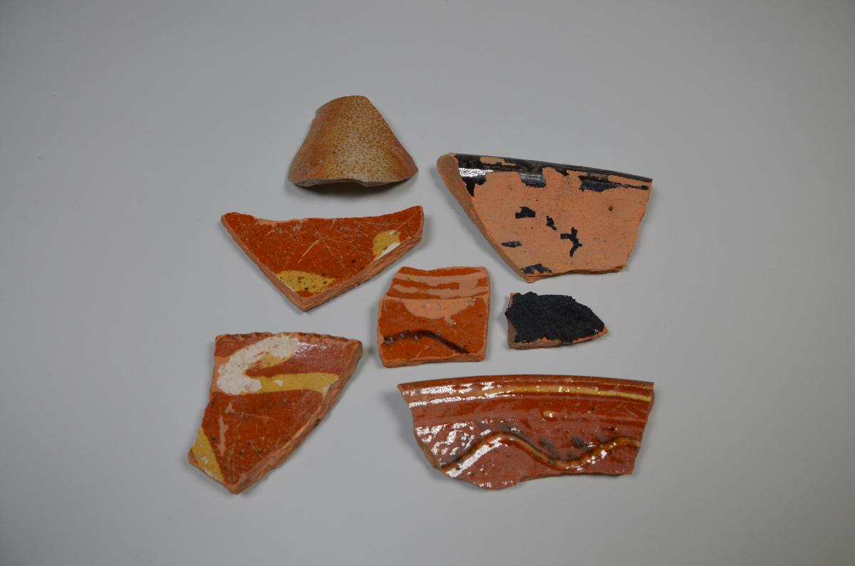 Fyra stycken skärvor glaserad rödgods från fat och gryta samt en skärva stengods från ett krus.