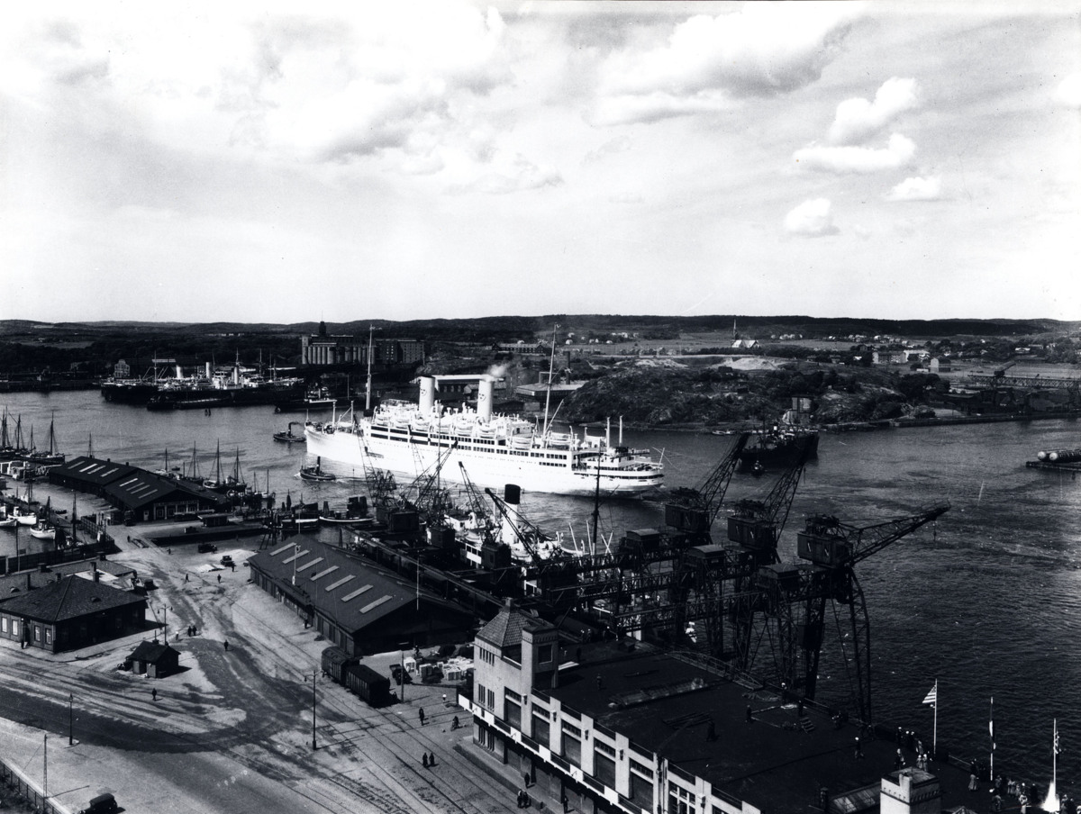 GRIPSHOLM är på väg att lämna Göteborg. Hon får hjälp av flera bogserbåtar. I förgrunden syns delar av Betongskjulet/Amerikaskjulet, kajkranar på Amerikakajen/Stigbergskajen och hamnbyggnader i Fiskhamnen. I bakgrunden syns delar av Hisingen med Sörhallsberget och Eriksbergs varv
