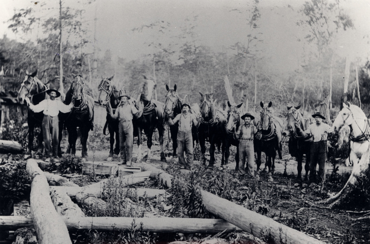 Svenska immigranter och hästar i skogsarbete i Nordamerika.