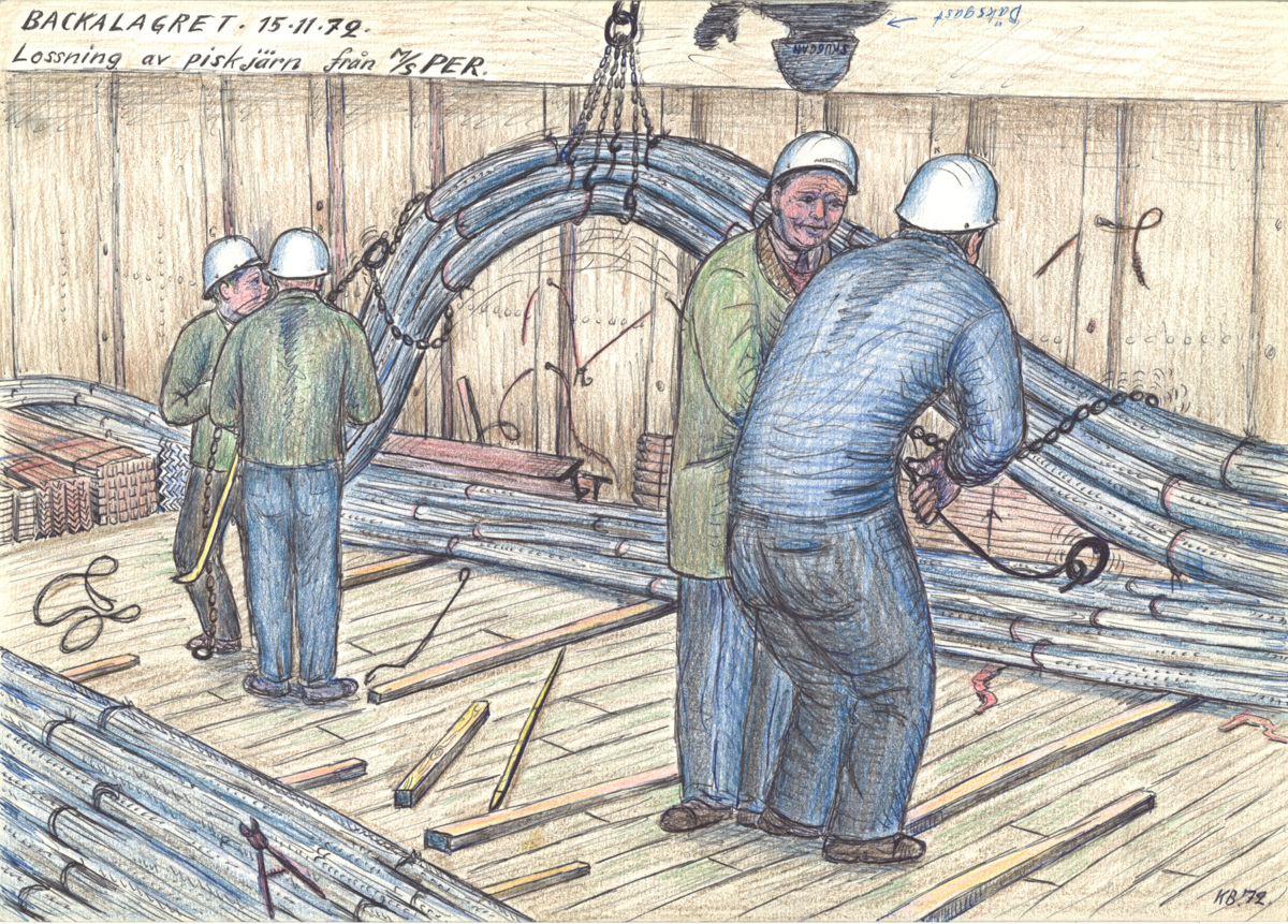Teckningen visar fyra män i lastutrymmet ombord på fartyget PER. De är i färd med att lasta av piskjärn med hjälp av en lyftanordning. Teckningen är daterad till 15 november 1972.