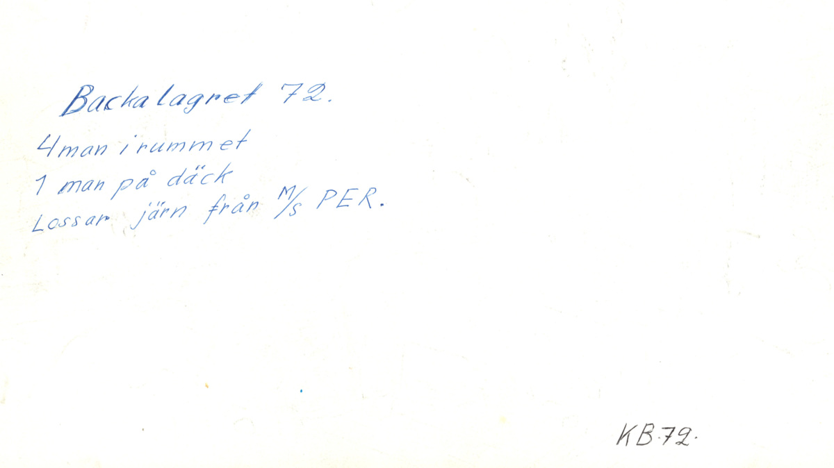 Påskrift: Backalagret 72. 4 man i rummet 1 man på däck lossar järn från M/S PER.