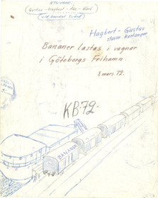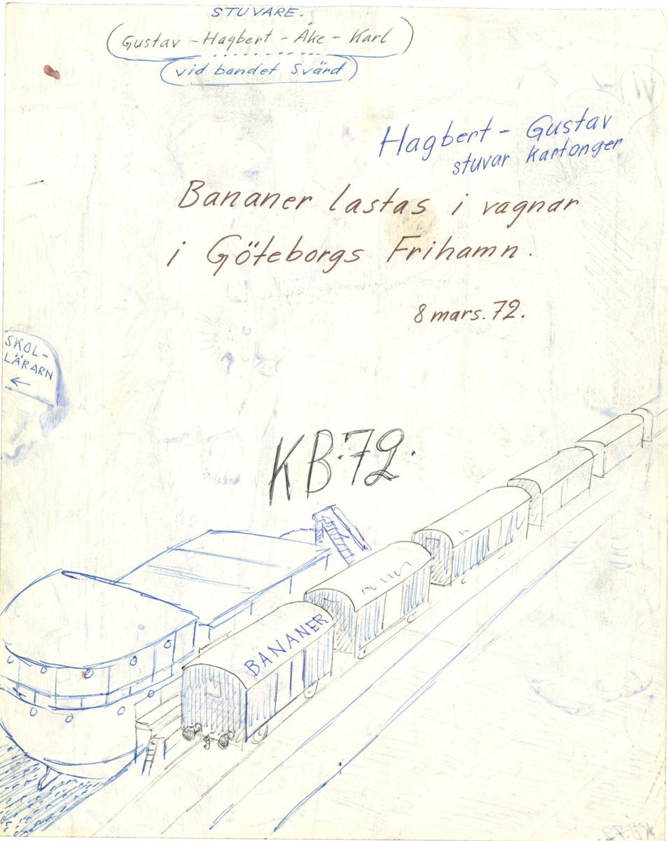 Två hamnarbetare, Hagbert och Gustav, lastar kartonger med bananer i en tågvagn i Frihamnen i Göteborg. I hörnet syns ytterligare en hamnarbetare, Åke. Teckningen är daterad till 8 mars 1972.