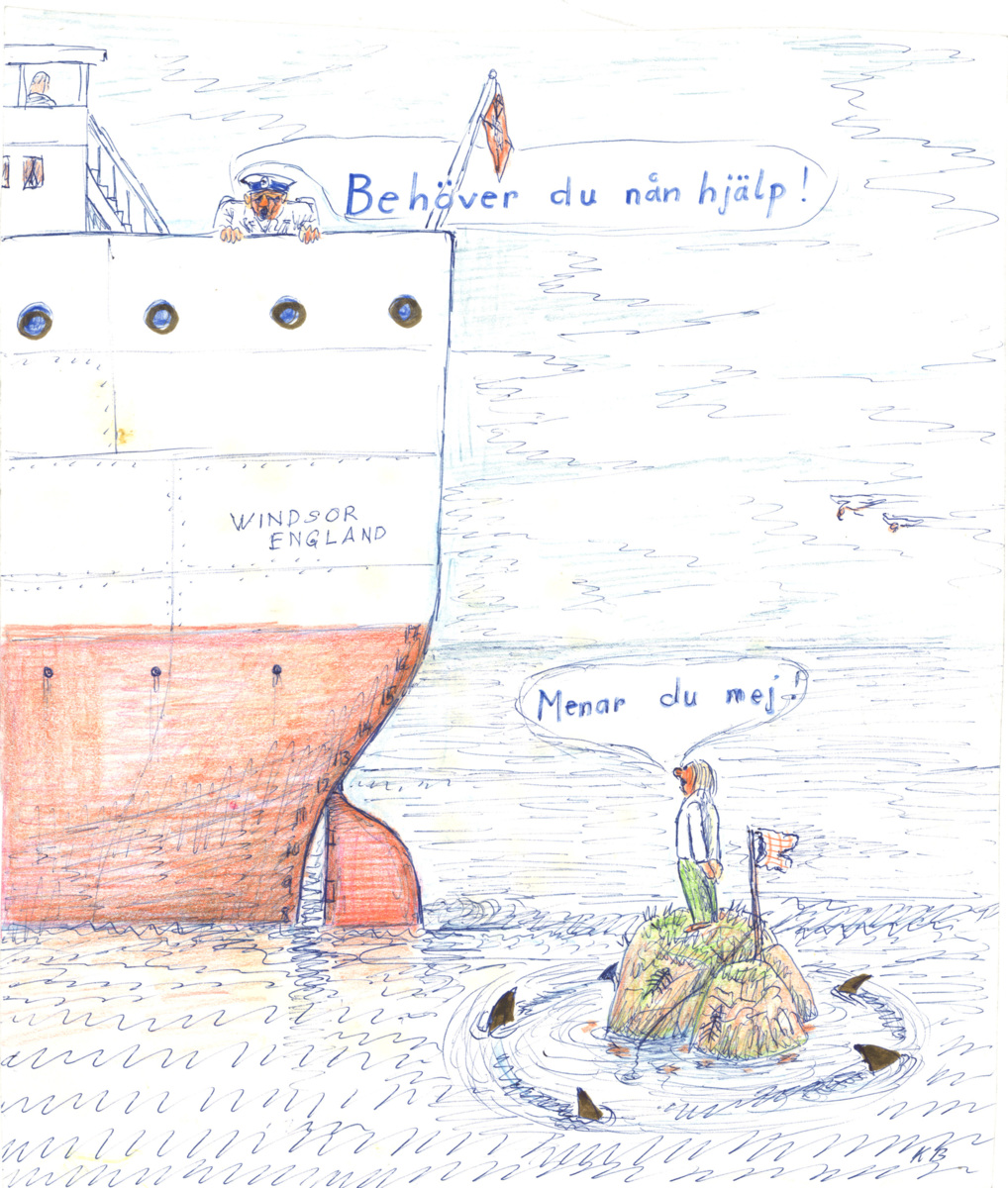 Teckning, man på kobbe blir räddad av engelskt fartyg