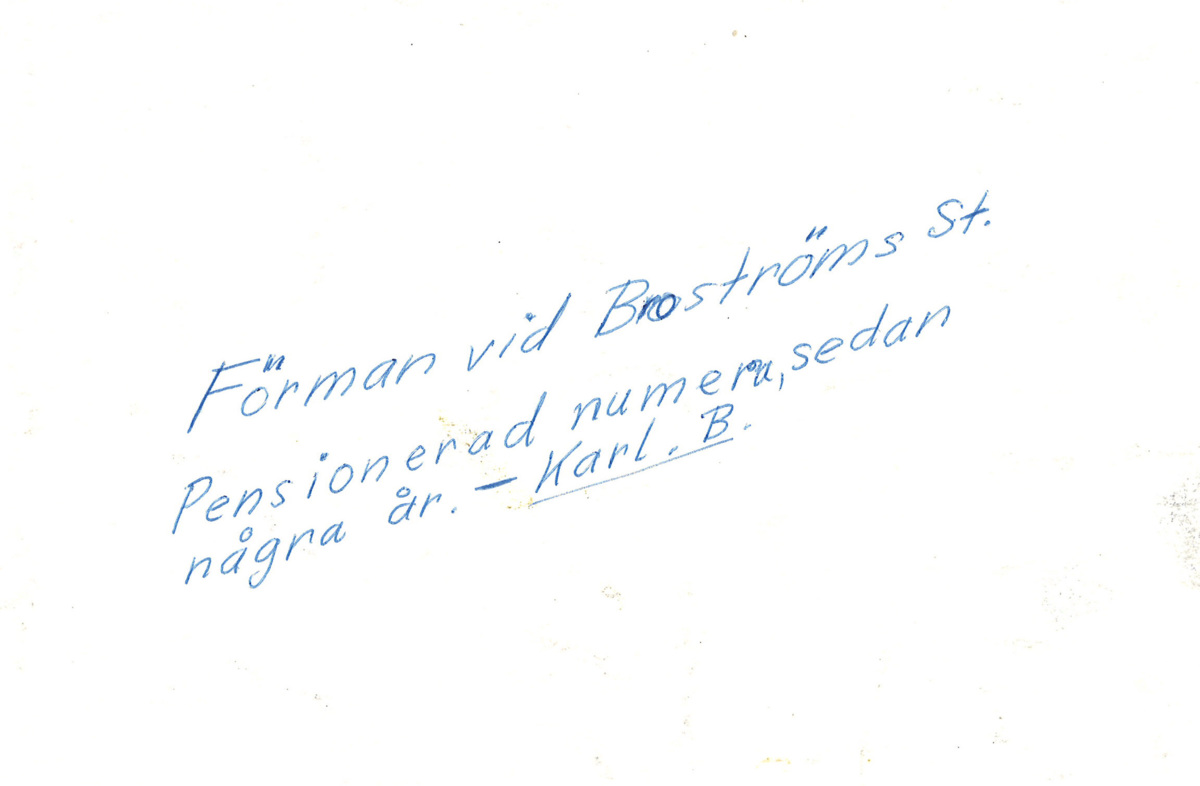 Påskrift: Förman vid Broströms St. Pensionerad numera sedan några år - Karl. B