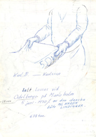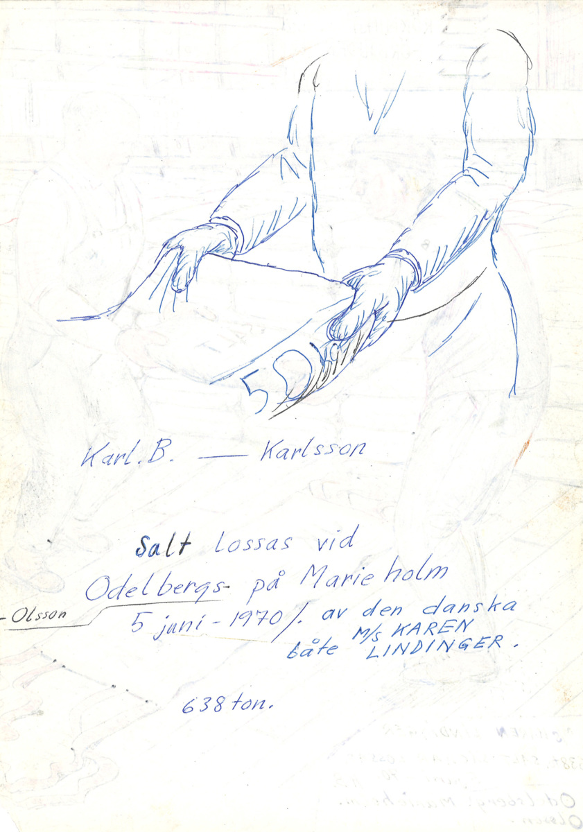 Två hamnarbetare hjälps åt att lyfta en säck med salt vid Marieholm i Göteborg. Hamnarbetarna heter sannolikt Olsson och Odelsberg. Saltet kom med det danska lastfartyget KAREN LINDINGER. Teckningen är daterad till 5 juni 1970.