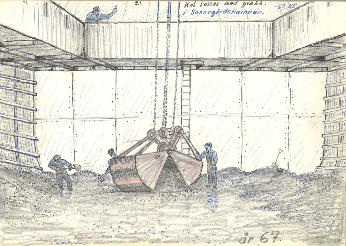 Teckning, kol lossas med grabb i Sannegårdshamnen
