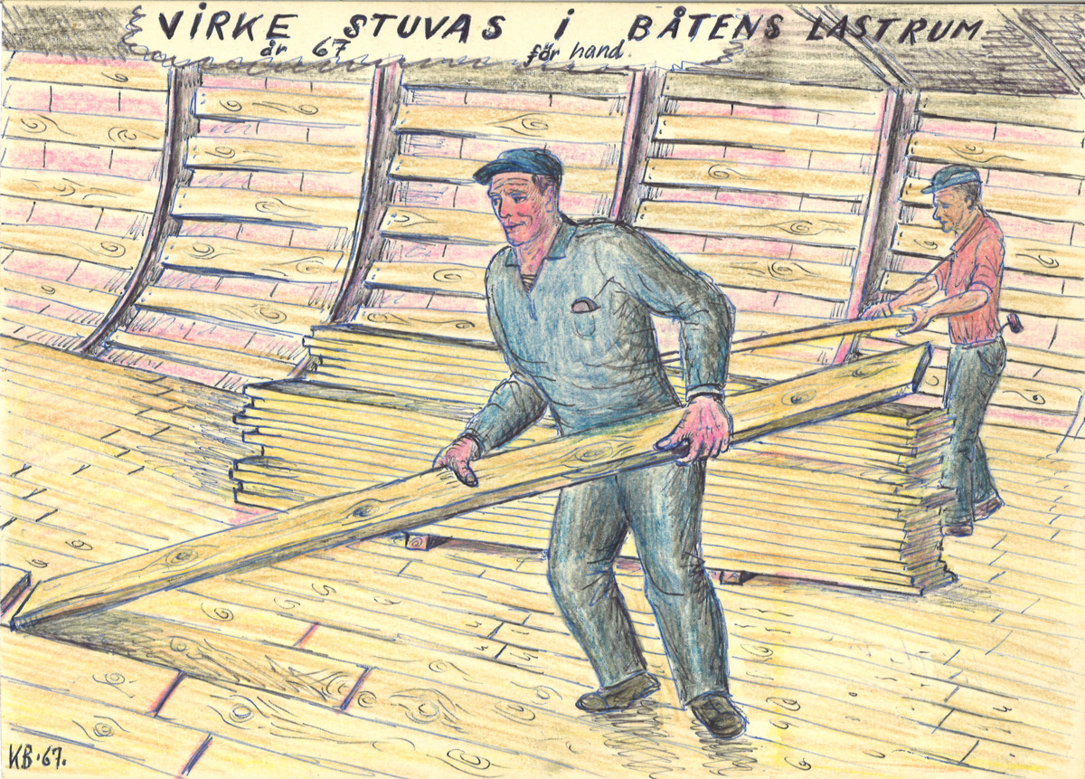 Påskrift: Virke stuvas för hand i båtens lastrum