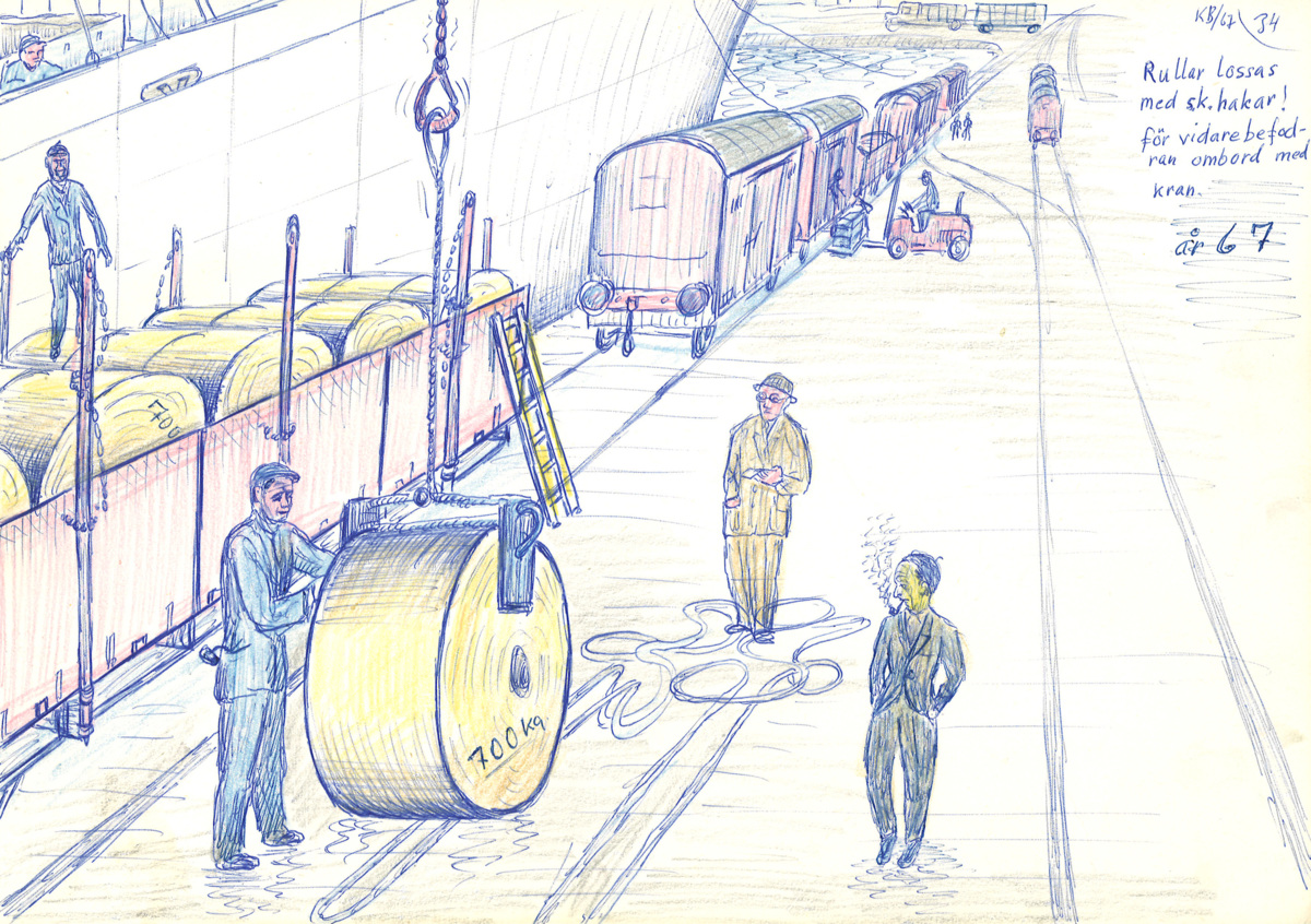 Teckning, rullar lossas från tågvagn