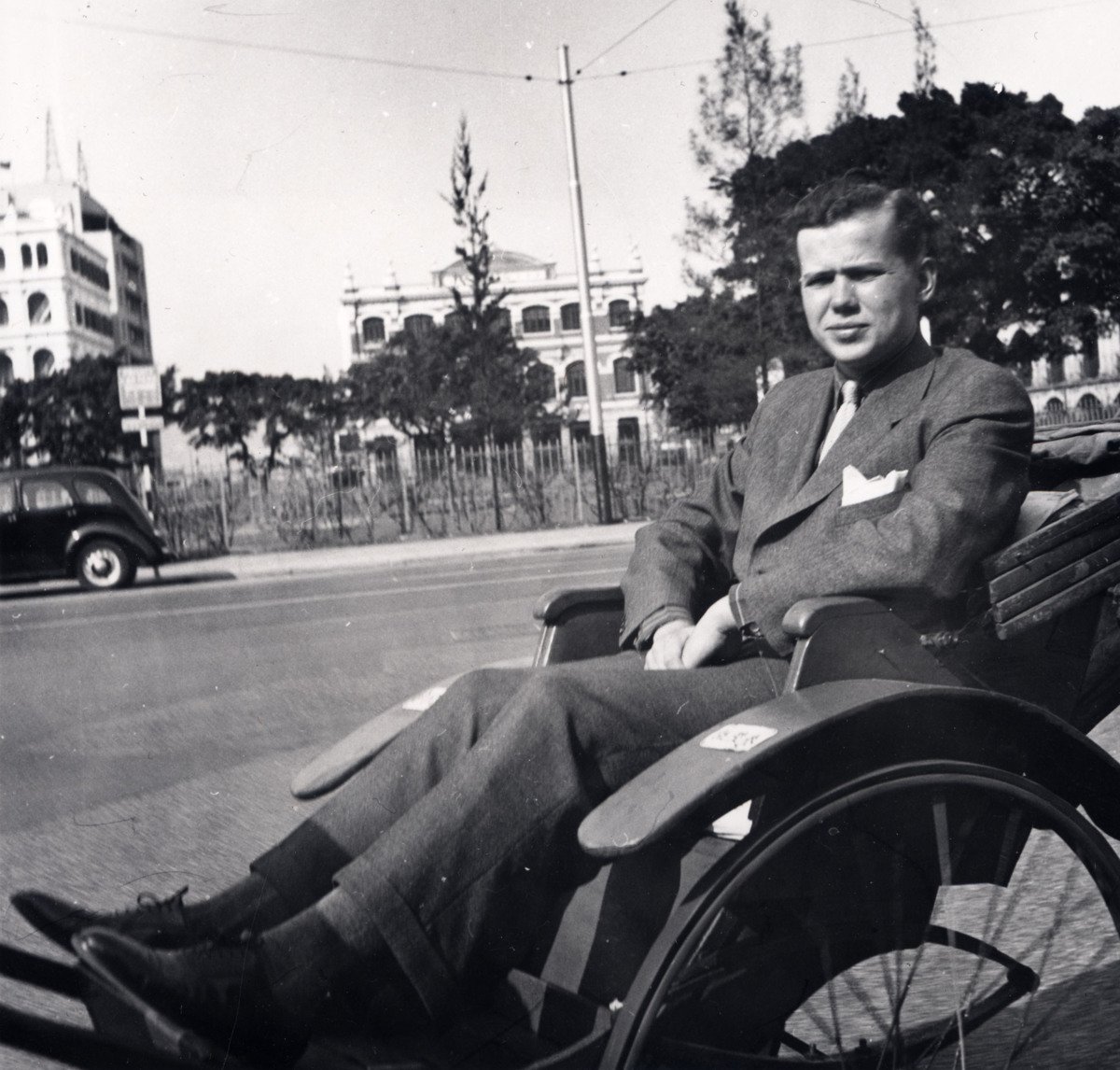 Stefan Centerwall sittandes i en rikshaw i Mumbai (Bombay) i Indien. Fotografiet är taget under KUNGSHOLM jorden-runt kryssning på våren 1956. Under kryssningen fick även besättningen möjlighet att gå i land och se sig omkring under de många hamnstoppen. Ibland ordnades speciella utflykter för besättningen (som ej fick beblanda sig med kryssningsresenärerna), till fördelaktigt pris, och i bland gjorde besättningen egna utflykter, då ofta i mindre grupper. KUNGSHOLM gjorde hamnstopp i Mumbai 4-10 februari 1956.