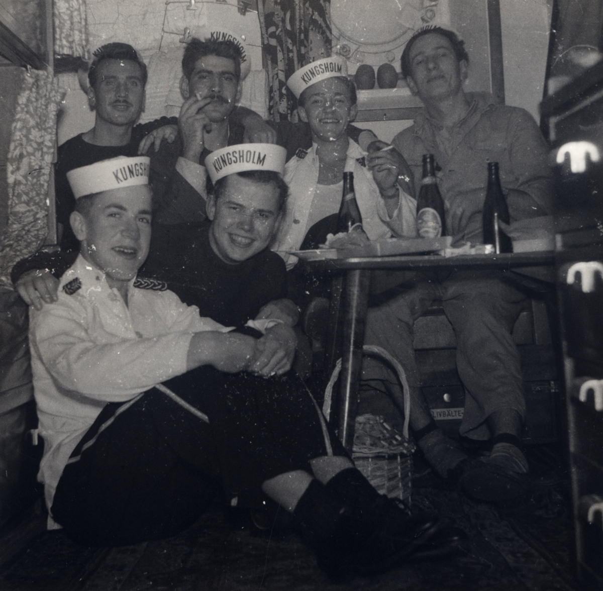 Fotografiet visar Stefan Centerwall tillsammans med tre kollegor i en hytt ombord KUNGSHOLM. Alla fyra arbetar som hisspojke. De två männen som sitter längst upp till vänster är italienska eller grekiska sjömän. Deras kolångare havererade mitt på Atlanten och KUNGSHOLM fick hjälpa till att rädda besättningen. Två av de räddade bjöds in på fest samma kväll av tillsammans med Stefan och hans kollegor.