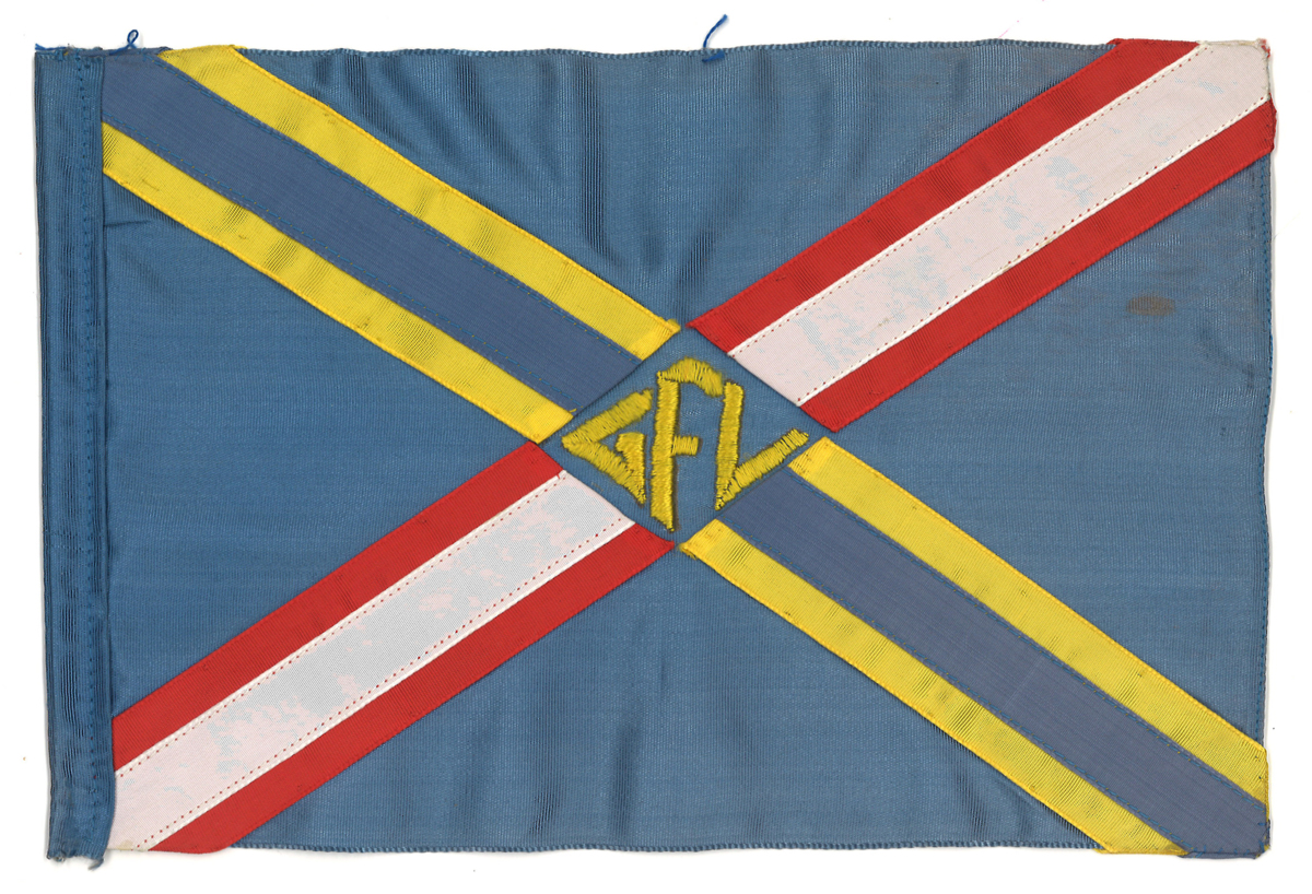 Rederiflagga för GFL av blått tyg med sydd kant runt om. Rederimärket består av ett heltäckande kryss med den ena stapeln i danska och den andra med svenska färger, sydd med hjälp av band. I centrum rederiets initialer 'GFL'.