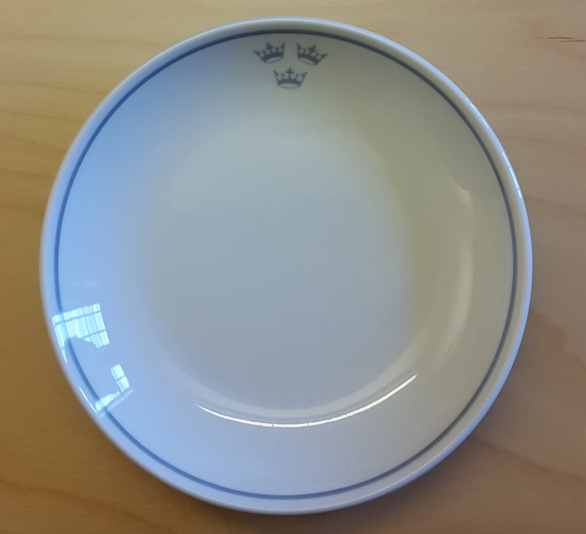 Mindre uppläggningsfat i vitt porslin med SALs tre kronor i ljusgråblått tryck på kanten samt en ränd runt brättet.
