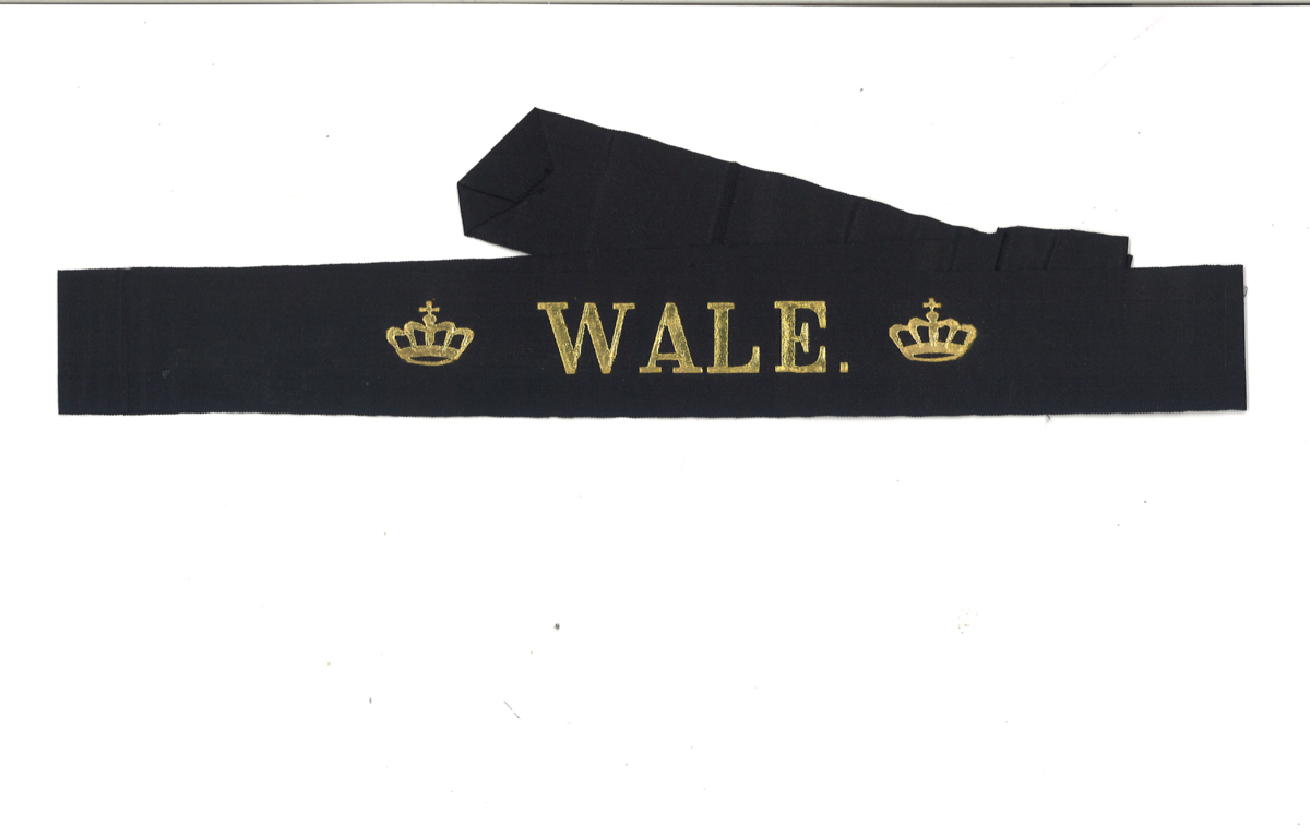 Svart mössband med guldtext.
