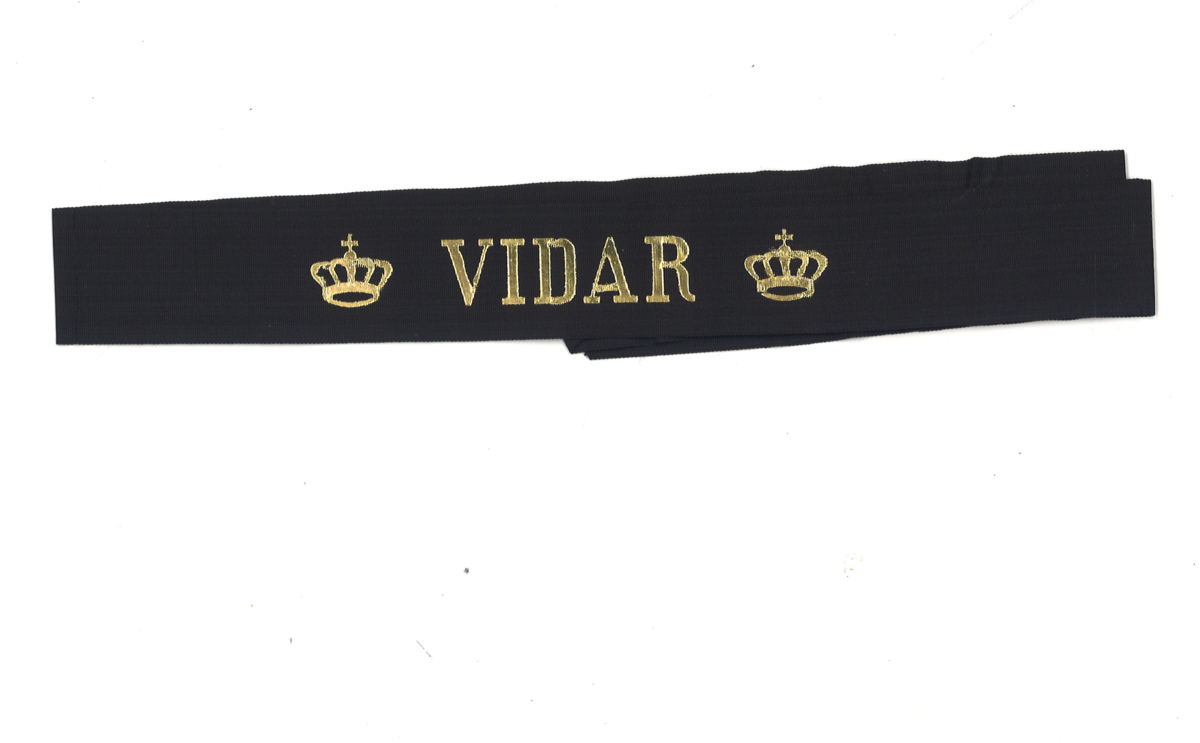 Svart mössband med guldtext.