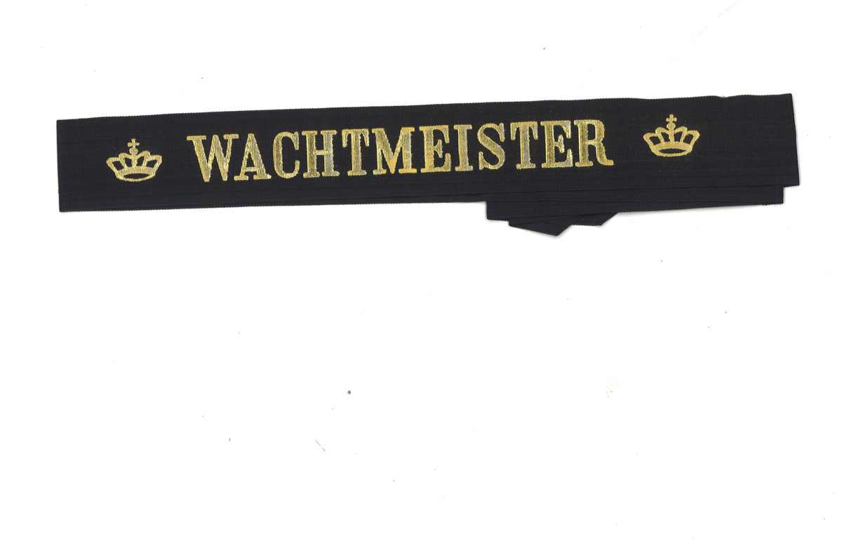 Svart mössband med guldtext.