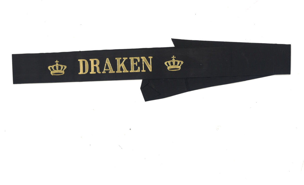 Svart mössband med guldtext.