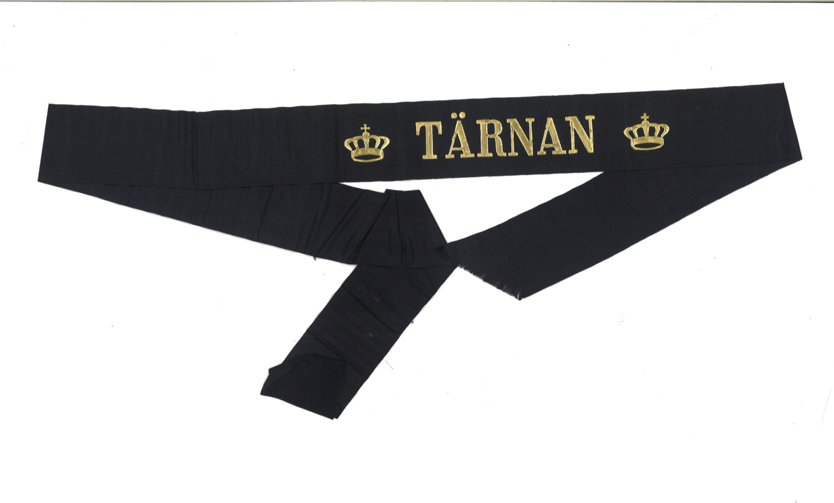Svart mössband med guldtext.