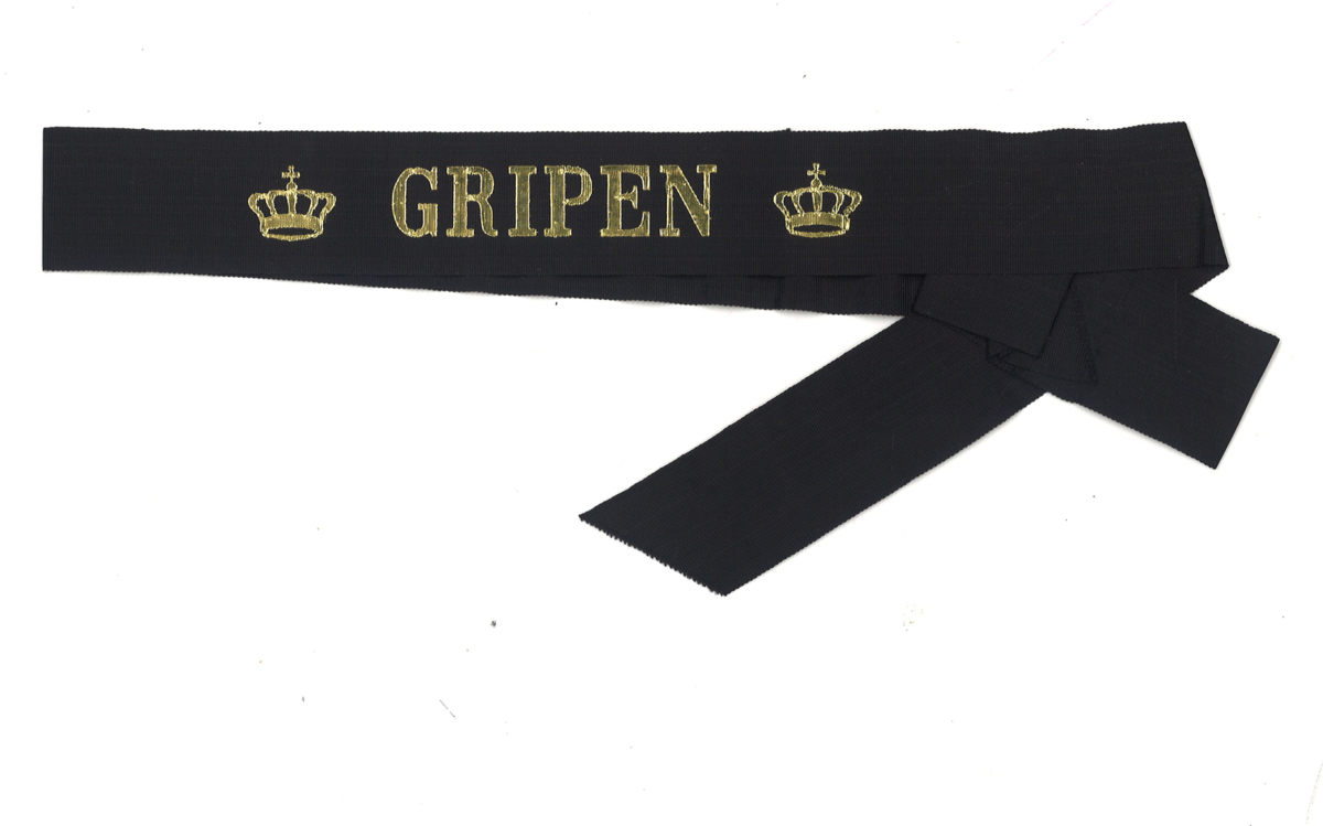 Svart mössband med guldtext.