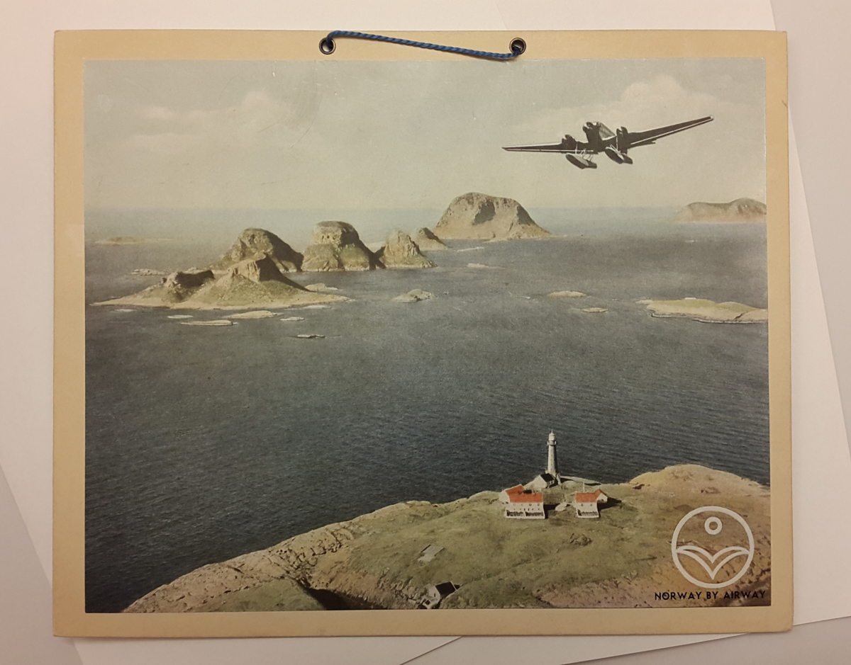 Tavla i papp föreställande ett flygplan som flyger över det norska landskapet.