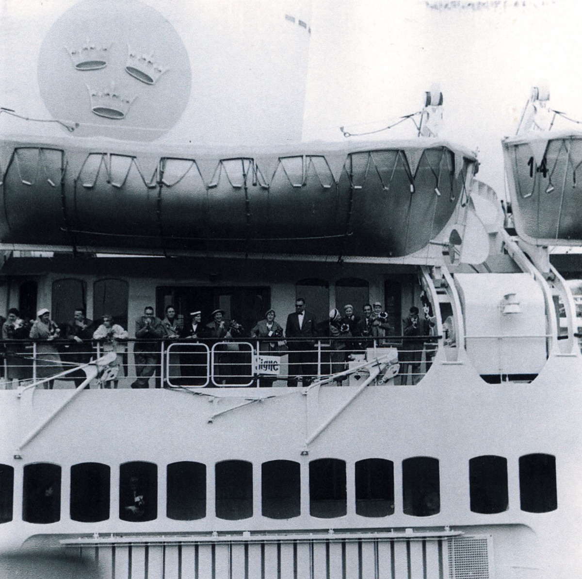 Familjen Rosén (Knut, Marianne, Stefan och Tomas) står ute på GRIPSHOLMs däck 14 maj 1957. Fartyget ska precis avgå från Göteborgs hamn på sin jungfruresa till New York. Familjen Rosén ska emigrera till USA. Det är dom som står nästan längst ut till höger på däcket (endast en man står längre till höger).