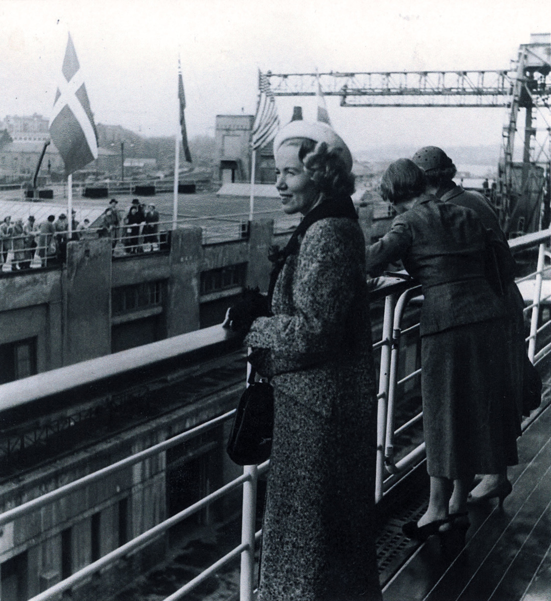 Marianne Rosén står ute på GRIPSHOLMs däck 14 maj 1957. Fartyget ska precis avgå från Göteborgs hamn på sin jungfruresa till New York. Hon är på väg att emigrera till USA, tillsammans med sin familj. I bakgrunden skymtar Amerikaskjulet.