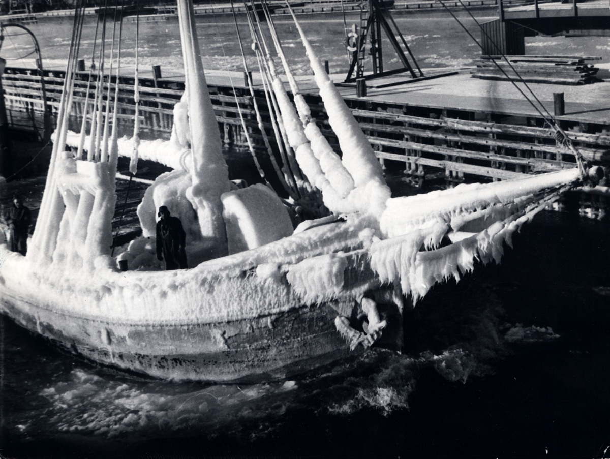 PRINS CARL täckt med is passerar gamla Hisingsbron i Göteborgs hamn efter en resa till Tyskland